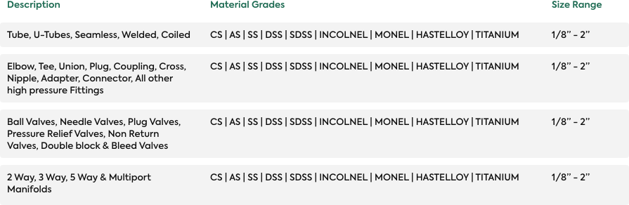- Pipes, tubes and fittings in the oil and gas extraction, e. g. in heat exchangers, evaporators, washers, immersion pipes in sea water cooled heat exchangers, offshore piping.